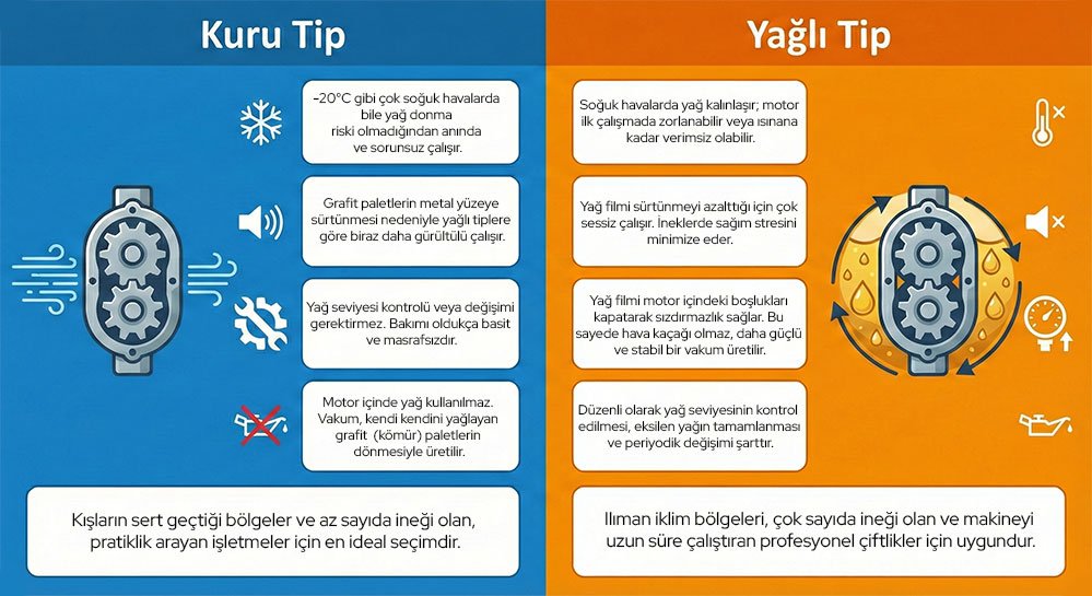 Süt sağma makinesi alacakların en çok tereddüt ettiği konu, vakum pompasının tipidir. Piyasada “Kuru Tip” ve “Yağlı Tip” olarak iki ana seçenek bulunur. Her iki sistemin de çalışma amacı aynıdır (vakum üretmek), ancak çalışma şekilleri ve bakım ihtiyaçları tamamen farklıdır.