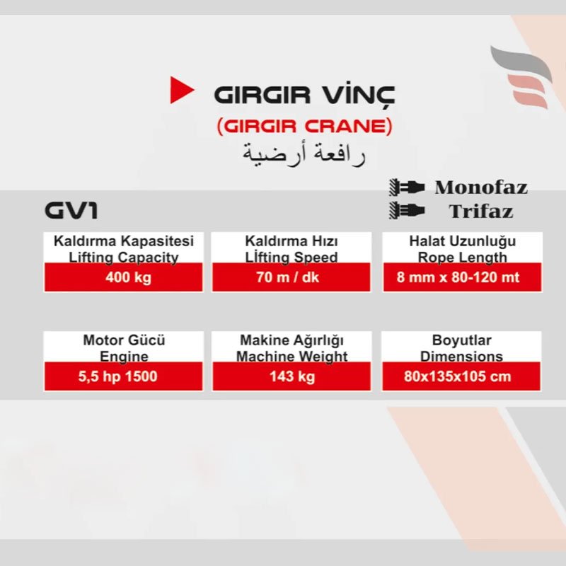 | Model Tipi | Yerden Kumandalı Gırgır İnşaat Vinci |