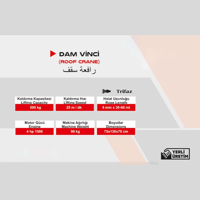 Büyük dam vinci modeli, 4 HP gücündeki motoruyla dikkat çeker. Bu güçlü motor, 500 kg ağırlığındaki yükleri saniyeler içinde yukarı taşır. Makine, dakikada 25 metre kaldırma hızına sahiptir. Bu hız sayesinde katlar arası malzeme sevkiyatını çok kısa sürede tamamlarsınız. İşçilikten ve zamandan tasarruf sağlayarak projenizi hızlandırırsınız.