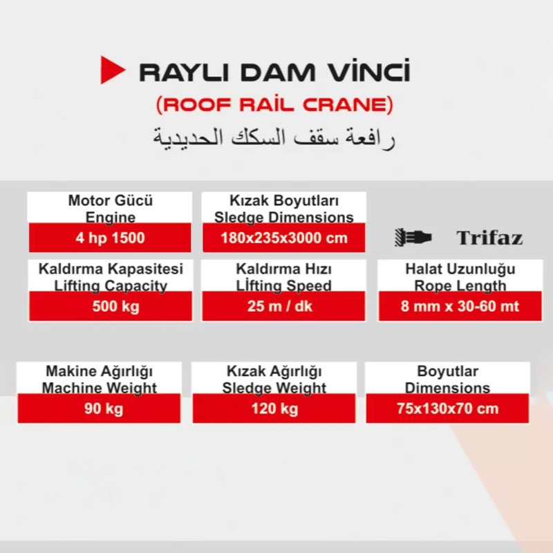 Makinenin 90 kg, kızak sisteminin ise 120 kg olan ağırlığı, sistemin dam üzerinde dengeli bir şekilde konumlanmasını sağlar. 180x235x3000 cm boyutlarındaki kızak (ray) yapısı, yük yukarı çekildikten sonra malzemenin güvenli bir şekilde dam içine kaydırılmasına olanak tanır; bu da iş güvenliğini en üst düzeye çıkarırken iş gücü maliyetini azaltır.